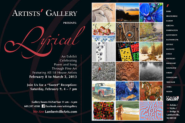 Artists' Gallery is pleased to announce "Lyrical", a group show featuring artwork by the gallery's 18 house artists. The show is a celebration of poetry and song through fine art. "Lyrical" will run from Friday, February 8, 2013 through Sunday, March 3, 2013. For this show of artworks for sale, each of the gallery's house artists will offer pieces accompanied by inspiration they received from a poem or song. A "sweets" reception with the artists, free and open to all, will be held at the gallery from 4 p.m. - 7 p.m. on Saturday, February 9, 2013.